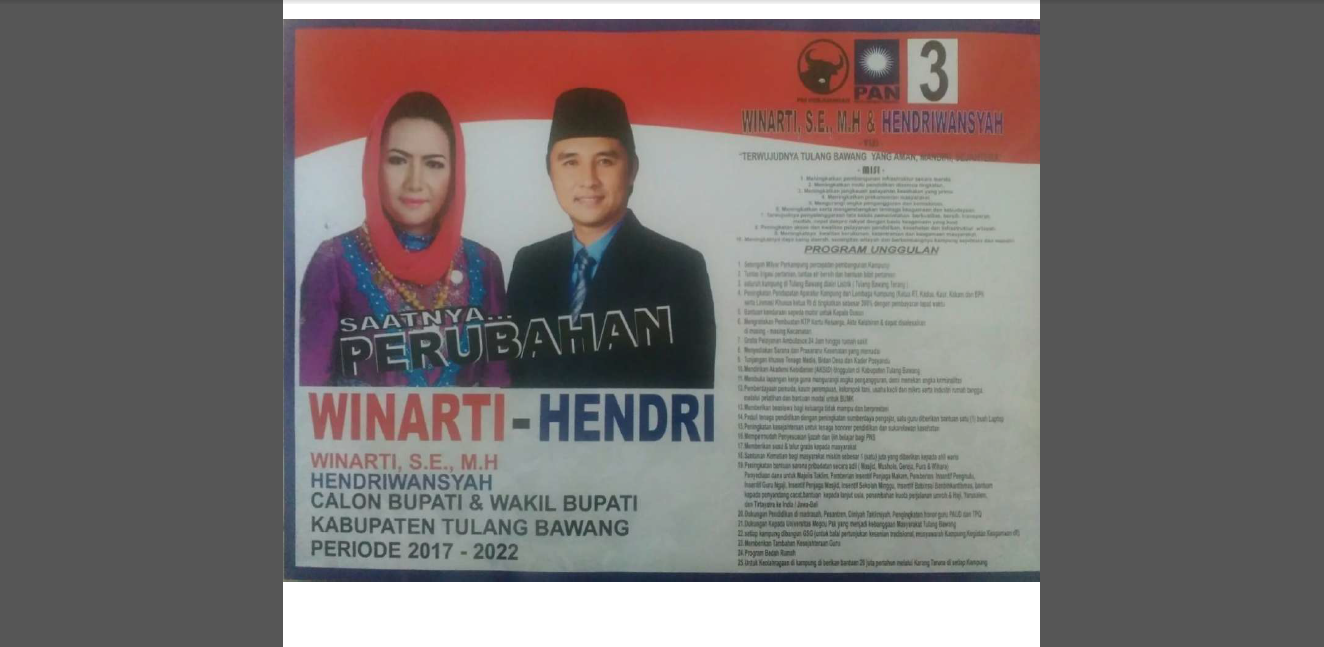 Pasangan calon Bupati dan Wakil Bupati Tulang Bawang periode 2017 – 2022 No urut (3) Tiga Winarti & Hendriwansyah