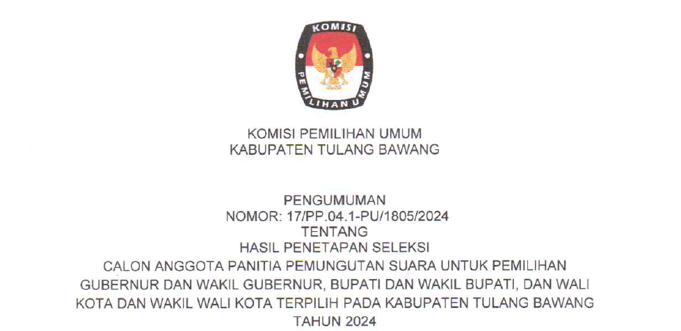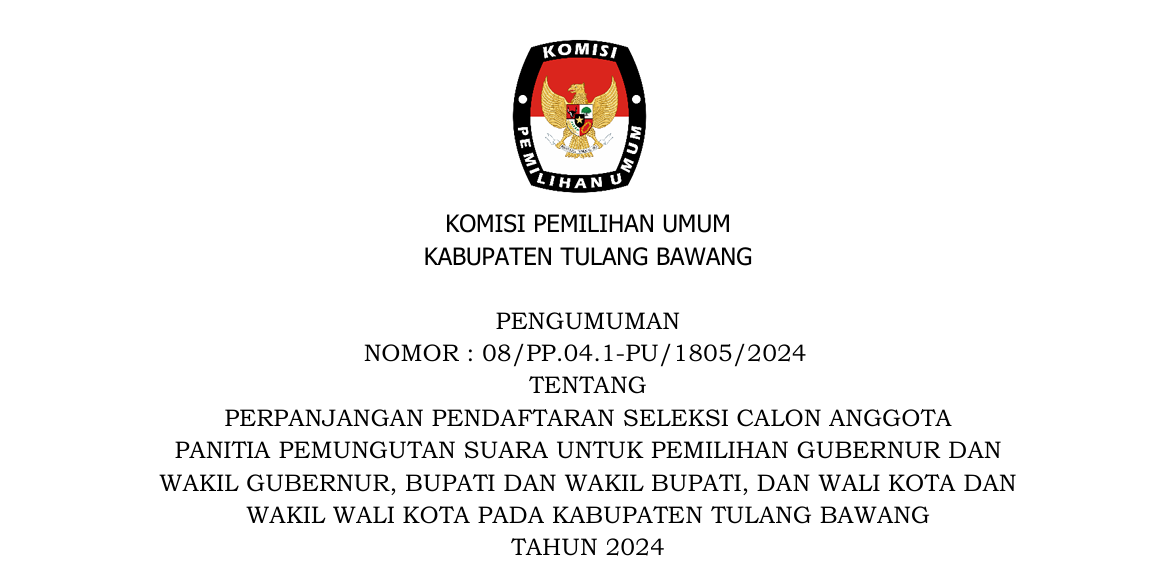 Sehubungan dengan hal tersebut, KPU Kabupaten Tulang Bawang, membuka perpanjangan waktu pendaftaran seleksi calon anggota PPS sejak tanggal 9 Mei 2024 sampai dengan tanggal 11 Mei 2024 pada kecamatan/Desa/Kelurahan sebagai berikut :